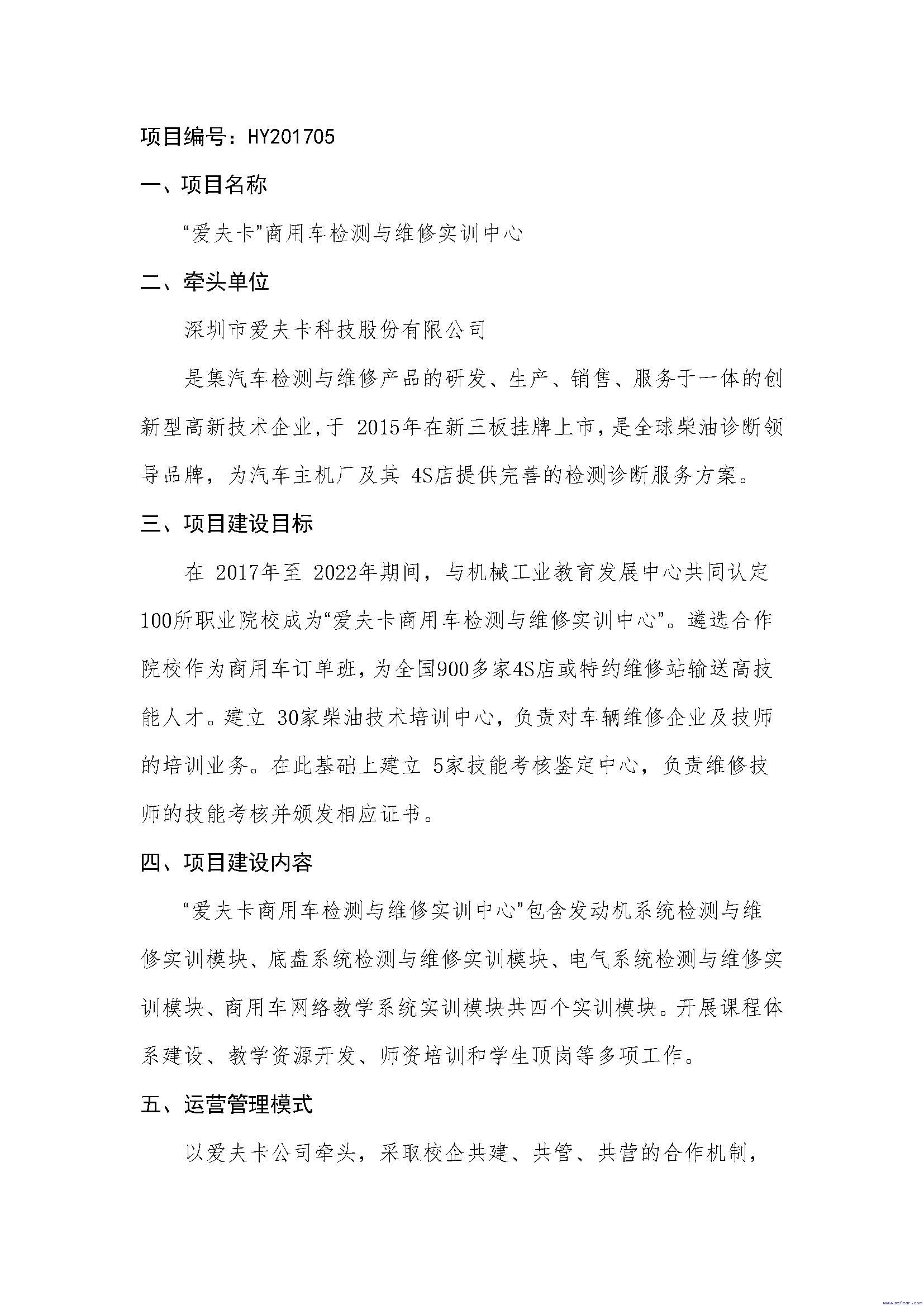 欢迎各职业院校报名项目申请编号为HY201705的“爱夫卡商用车检测与维修实训中心”校企合作项目。本项目规划如下: