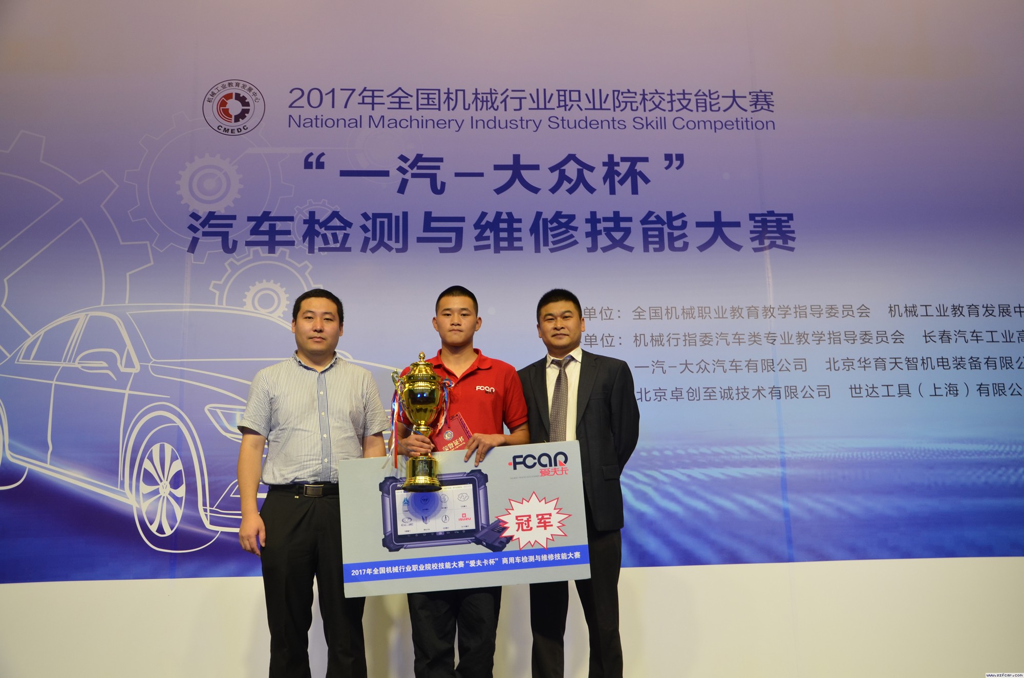 机械工业教育发展中心产教合作处处长、全国机械职业教育教学指导委员会产教合作与促进指导委员会秘书长王志强和深圳市爱夫卡科技股份有限公司董事长姚勇为“爱夫卡杯”商用车汽车检测与维修技能大赛颁发冠军奖杯