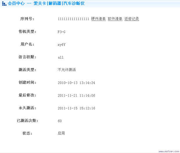 点击进入保修信息网页右方会显示出您机器的网上保修卡信息如图8-1所示,包括有保修期限、注册日期、激活日期、返修信息等。点击查看返修记录可清晰的查看到您解码器的所有有关返修的详细信息如图8-2所示。